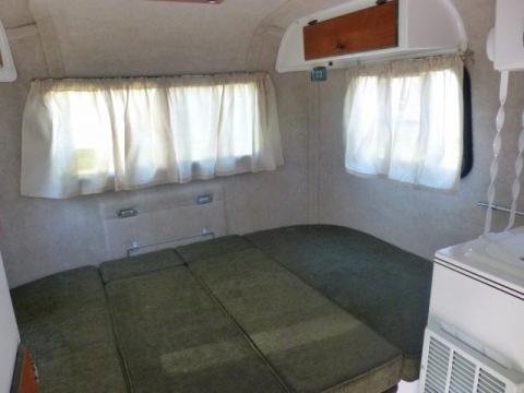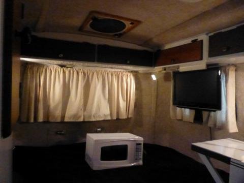 The 19" HD TV with DVD player is mounted to metal plate strategically placed to use the framing of the right hand window, which we don't use anyhow. Behind the TV is a specail window mounted HD TV antenna stuck to the window, it is tight in there but I did it. Now I have to move it over 4 inches more to the left to allow the installation of our new Microvave that you see pictured on the bed. I have not done this as yet but will before our Arcadia Bus Rally trip at Christmas Week in Florida. With this TV antenna we have to program it where ever we move to for vacations, two weeks ago at Palmetto Cove, Cleveland, SC we picked up 7 stations which is great. But we will always bring some movies with us incase the reception is not good for TV on rainy days. NIce days we enjoy sitting with friends, chatting lying, kicking tires, more lying and enjoying life of the Scamp Campers we also want to be as well as Bus Nut owners.