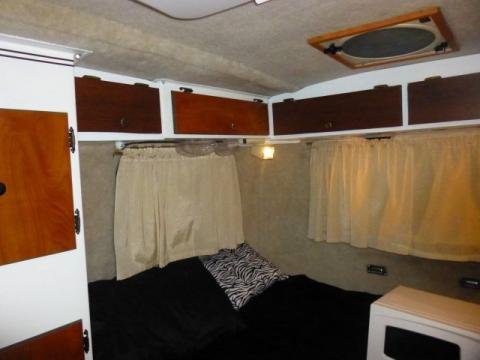 This is the inside of our stock standard 13' Scamp which has a shower and toilet, Yessss!! Not much overhead storage area, the same size cabinet is on the left hand side of Scamp.