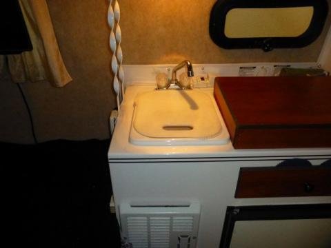 This is a photo of the actual work area our mates has to prepare meals etc. and a little shelf can go a long ways for assistance needed to place things. I will install our Microwave above the new shelf I made next to the TV. It will be alittle tight but will make life easier forus all to have many of the comforts a larger camper has over us all.
