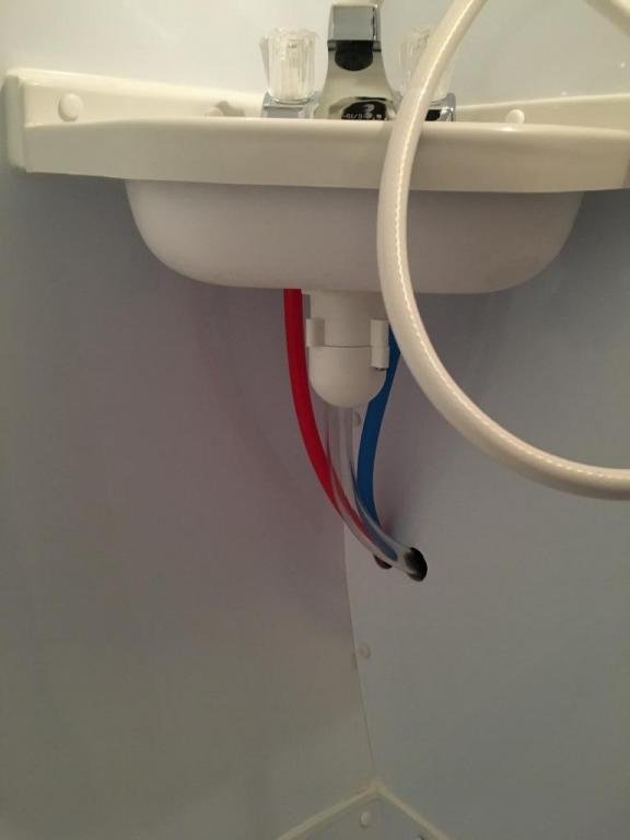 We looked at the sink arrangement and deleted ours from the build. The major concern was having room to move about in that space. I agree with your observation that water can follow down the tubing and could end up being a problem. Maybe plumbers putty to fill the gap?