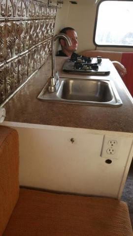 Tested the height/depth of new sink/faucet. The sink is just a bowl from Target and the faucet is a collection of brass plumbing fittings from one of several hundred trips to Home Depot. Also fiberglassed the huge holes where the old fridge vents were as well as a billion little rivet holes, water inlet holes, etc.
