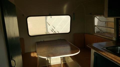 Table installed with new hardware, side window installed, and the beginnings of a new side table for the dinette/bed