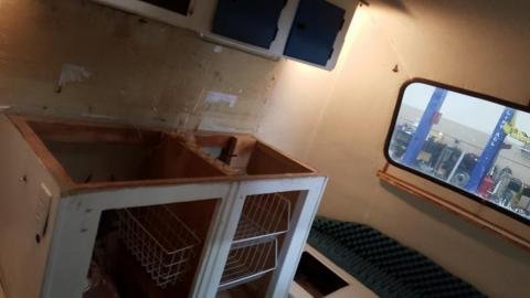 Took out the kitchen, overhead storage, bench seat/bed and closet to see how solid the floor, frame and body were and give a blank slate for new floor plan and a thorough cleaning