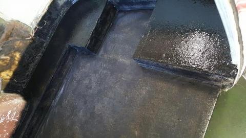 Then fiberglassed wall to floor to wall so everything stays in place and no chance at water rotting the wood from the inside at least, patched in some spots that had damage and then used bed liner on the floor - looks nice and more waterproofing...