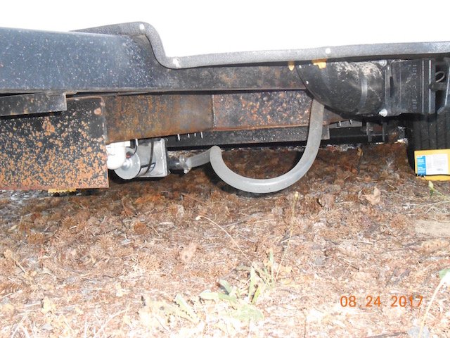 That is too much slack in the hose. The hose connects to a plastic hose barb on the rear of the grey water tank. You might want to check to make sure it has not come loose from the rear of the grey water tank. Above the slack hose in the front there is usually a 1" (I think) EMT clamp that is screwed into the bottom of the wood floor to hold the hose up. The screw and clamp may have come come loose and fallen off the trailer. You should see the same style clamps holding the hose to the outside of the trailer frame.