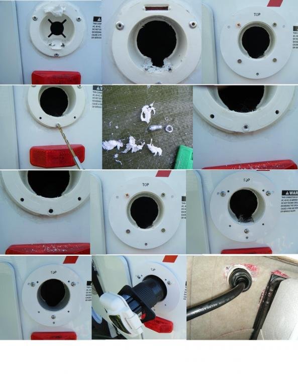 I used and modified the original WHITE power cord cover (from Scamp) to help in reducing the curvature of the camper to a flat surface, (as much as possible) for mounting the new power cord face plate...
