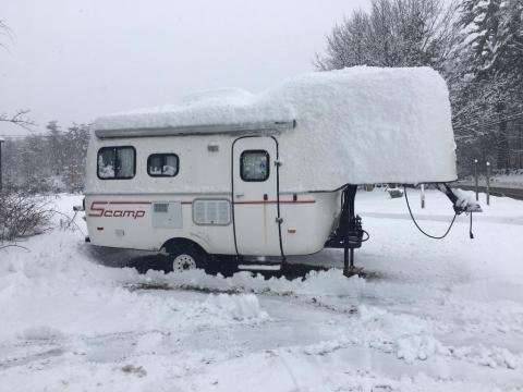 My wife and I are the proud new owners of a 2005 scamp 19. We are downsizing from a 37 foot diesel pusher to a scamp and my Ranger pick up. Bought it at a local charity auction for a great price but of course would've loved it to be less. Scamps are pretty hard to find in the Northeast especially a 19 this is the first 19 I've ever seen in person. It's been parked since about 2009. The interior is pretty perfect and the exterior we hope will clean up great. We were going to start the cleanup process today but will turn out to be 15 to 16 inches of snow in Manchester New Hampshire threw us off a bit.