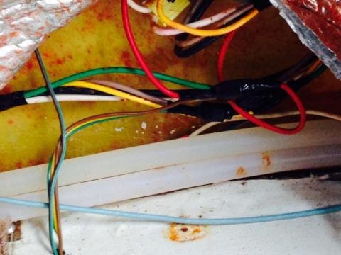 Used tap splice connectors to avoid cutting and wire nutting the connections. These seem to have a propensity to pop open so they were taped. Scamp appears to use these all around the trailer on the 12V system.