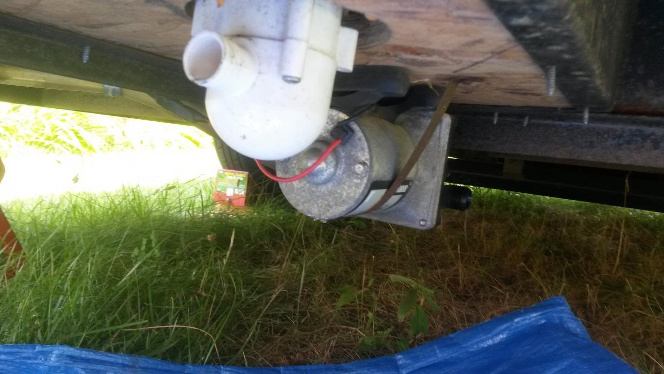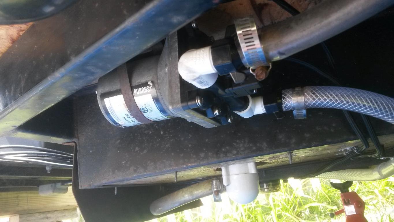 Here's a bottom view of the new pump mounting (the front of the trailer is towards the right of the picture).
