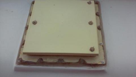 After cleaning, put down 2 strips of Colormetrics Gray Putty Tape / Butyl Tape 1/8" x 1" x 30' (Single Roll) around the opening, set the new vent and pulled the rivets snug then broke off the stems with pliers instead of snapping them off with the snap rivet tool. Put excess butyl plugs over rivets.