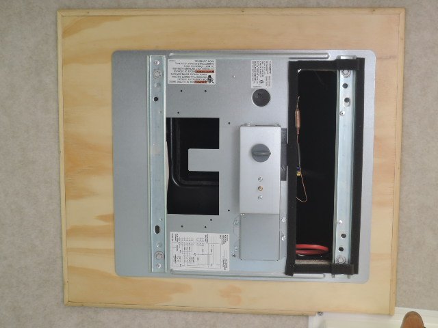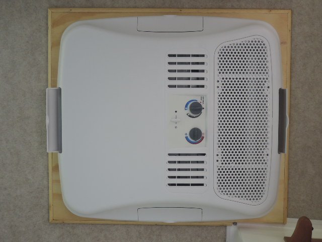 AC on our '06 Scamp 16' quit. It seems finding and repairing a refrigerant leak and then recharging a sealed R22 unit is next to impossible. None of the RV shops around here knew of anyone who would/could do it. The Coleman MiniMach 7200 BTU is no longer available and Scamp now installs the Dometic BriskAir II 13,500 BTU unit. Scamp Parts has the new one available but shipping charges make it very expensive. I saved over $300 buying online. The Dometic is designed for stick built trailers with thicker roofs than Scamp, both to accommodate the mounting bolt length and the screws for the ceiling unit. I solved both problems by using a plywood spacer inside above the ceiling unit. Pictures are (hopefully) attached. My wife and I used a ladder for a ramp and tie down straps from the far side to remove and re-install the roof units.
