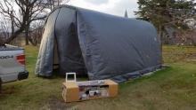 My Scamp is now parked in its winter "nest". Got the shelter at Menard's. $400. On sale. A very good fit. I was able to back right in. I added extra stakes. See pic. The door had only 2 zippers. Called the company. They sent a new one with 3 like the pic on the box. No charge. Highly recommend this unit.