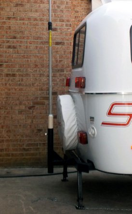 Used a HamStick 20 M dipole on two end to end fiberglass masts (tree trimming castoffs) that were mounted in a flag holder in the Scamp's optional rear hitch receiver. It got the dipole to about 25 feet. It works fine but is of course a single bander. The fiberglass "mast" could also support a sloper, inverted V, etc.