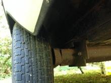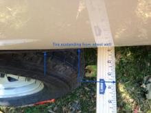 Eddie, I took your advise and checked every support and weld on the undercarriage. Kent at Scamp requested photos of undercarriage, one is included. Then this morning while enjoying my morning coffee outside, I noticed the left-side tire was outside the wheelwell, see photo. Checked the right-side tire and it's all inside the wheelwell as it should be. Called Scamp to confirm this is not normal - could be axle alignment. Just one more wrinkle in what began as a "Closet-Rivet" issue. If you would like to see the full array of photos, I have them in Dropbox, just send me your email address via PM.