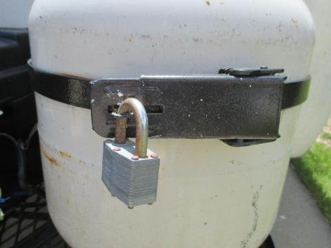 The quick-latch on the LP tank is made from the original Scamp tank holder that I just set on the tray and welded it to it. The latch is the type used on pop-up type campers. I bent one end of the strap back on itself to form a lip, and straightened the other one. Then I welded the latch to the strap. It is adjustable so it can be adjusted to fit the tank, and locked to keep it from walking away!