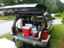 The back of the car was even more packed for 4 months of travel more than this when we actually left. You have no idea how much stuff we needed and how much we decided not to take as we felt we did not need it. But you will be surprized how much you have to replace on the road that you do need. So a lot of thought has to go into what you pack, and not just over one days time, a dry run set up has to be done for a trip like this as well as allowing for storage for the guinea's in day time and night time. Different cages for their comfort.
