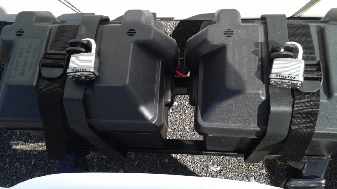 I've lost one 12V battery over the years to thieves that hit the storage lot. They drove in, cut battery cables, threw the batteries in a truck and were out in short time. I used bike cables after that, but were never a great solution. Locking boxes were too expensive, so I found this solution that had quite a few positive reviews: